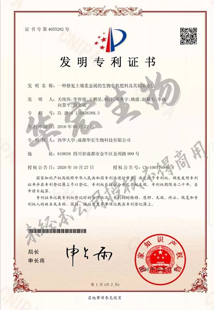 • 一種修復(fù)土壤重金屬的生物有機(jī)肥料及其制備方法專利證書